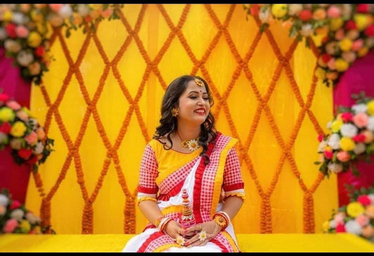 গাইহালুদ স্পেশাল গামছা হাতে তৈরি ফ্রি সাইজ ব্লাউজ সহ শাড়ি (সাদা)
