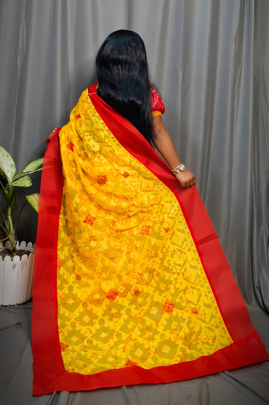 এক্সক্লুসিভ প্রিমিয়াম কোয়ালিটির বাচ্চাদের ঢাকাই জামদানি শাড়ি – হলুদ এবং লাল