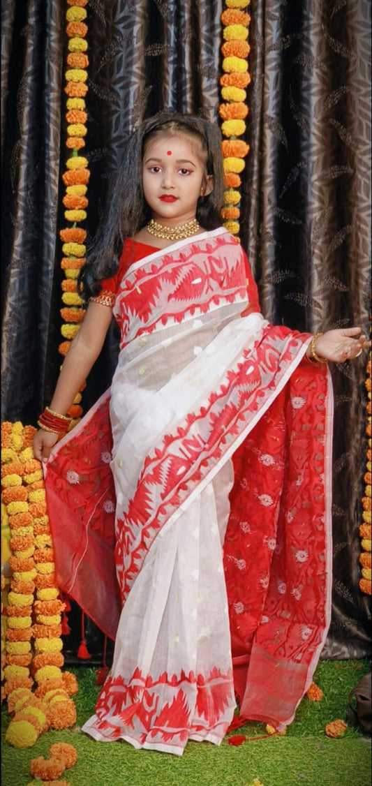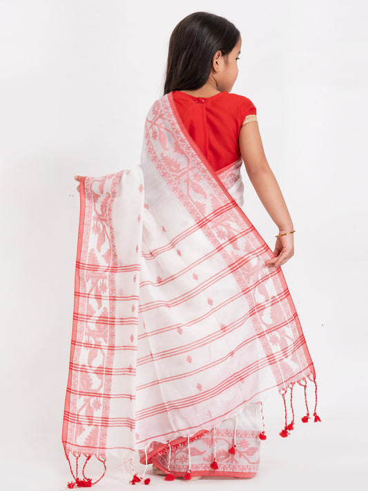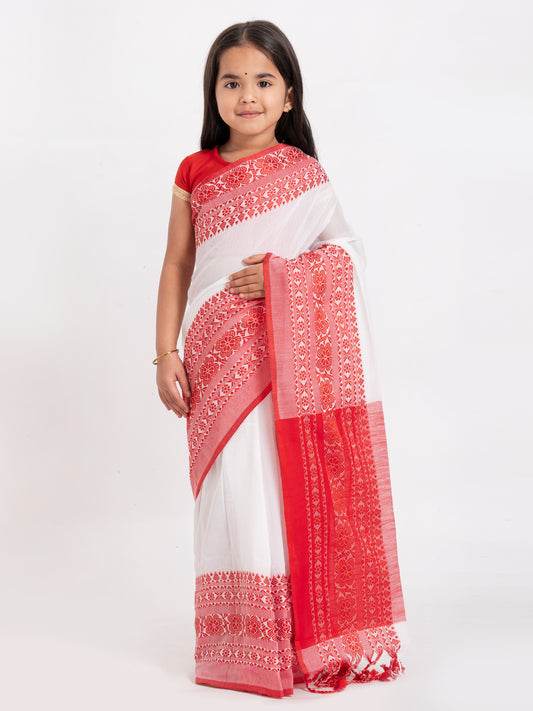 Exclusive Premium Quality Kids Dhakai Jamdani Saree – White & Red