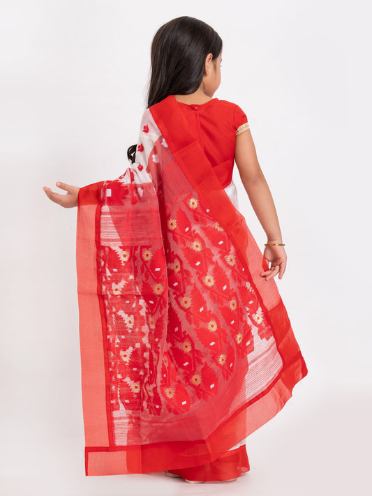 Prodip Design Dhakai Jamdani Kids Saree in Red and White