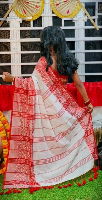 Exclusive Traditional Cotton Saree with Red Border, Floral Print Design Saree, Costume for Girls