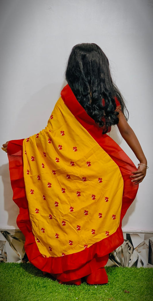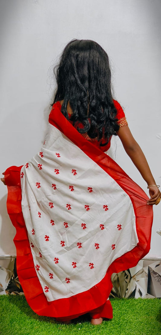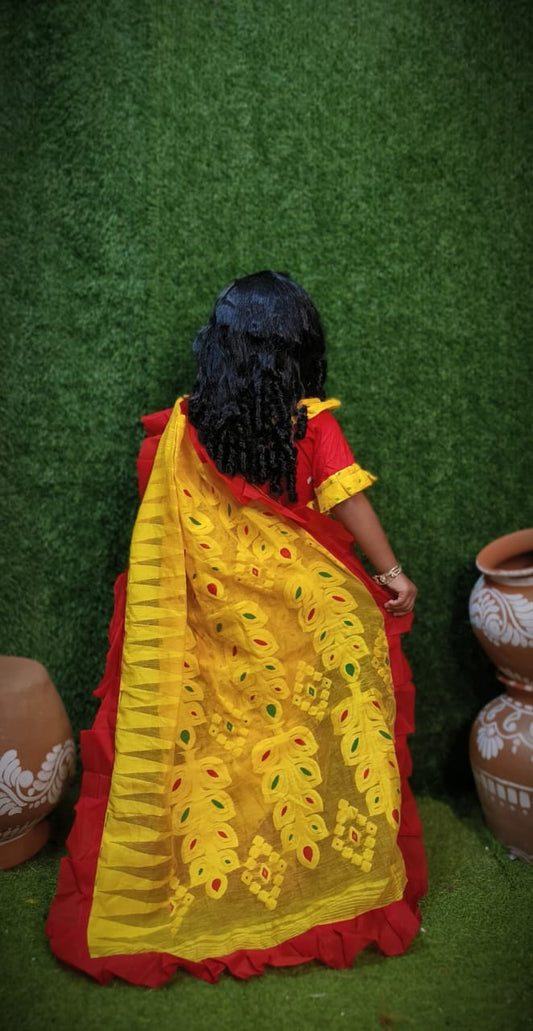Exclusive Saraswati Pujo Special Jamdani Ruffel Embroidery Kids Saree For 2 - 6 Years Olds
