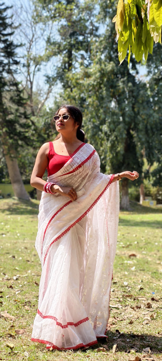 Exclusive White Red Combination Lace Work Dhakai Jamdani Saree Without Blouse