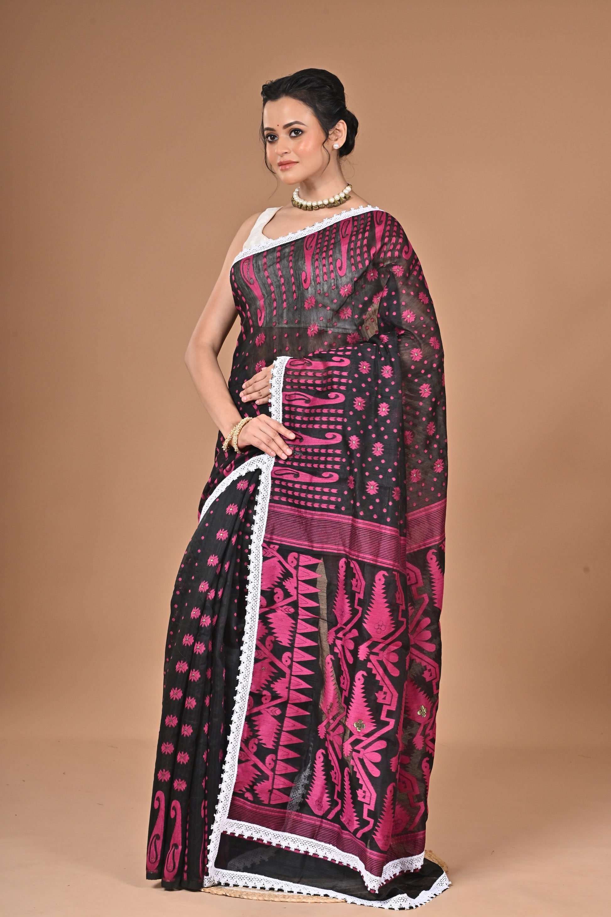 New & Exclusive Korat Dhakai Jamdani Saree – White with Lace Border | Cotton Silk | 5.5m | No Blouse (Black)
