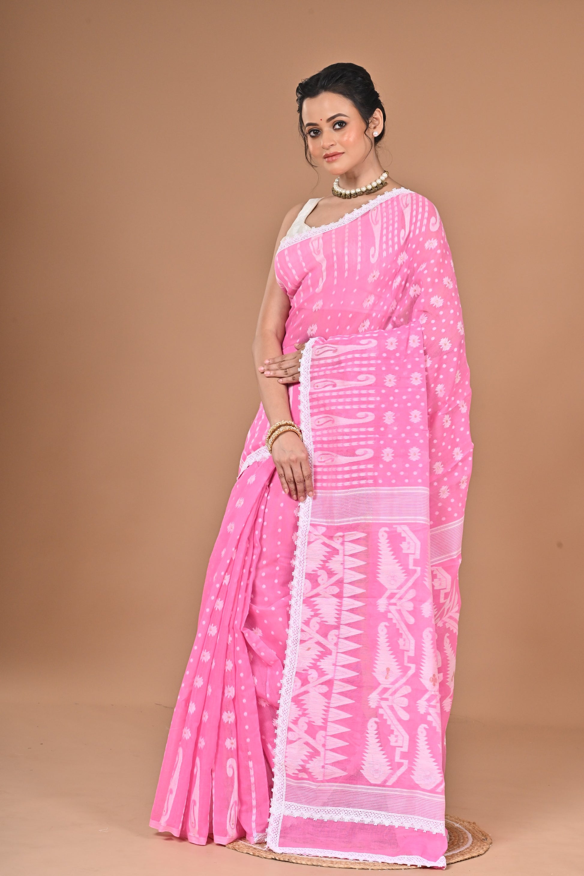 New & Exclusive Korat Dhakai Jamdani Saree – White with Lace Border | Cotton Silk | 5.5m | No Blouse (Pink)